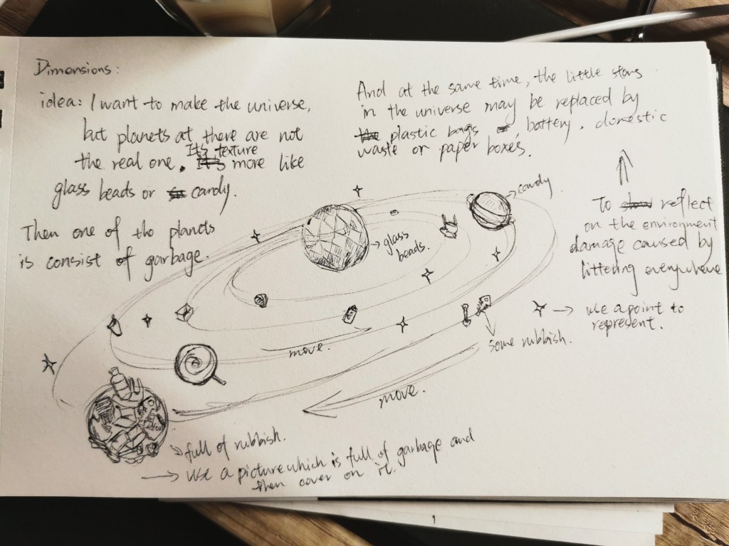 Originally I wanted to add some garbage to the universe and merge a certain planet with garbage. I wanted to express the consequences that human activities may have on the universe … But later in the production process, I felt that garbage would Destroyed the overall beauty, so did not add this idea into it. Like this: